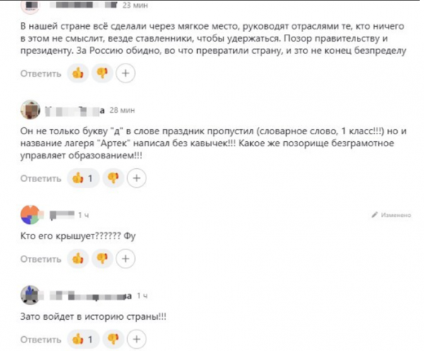 На память чиновник оставил своё фото с автографом, и в официальной прессе об этом не сообщалось. Зато в ряде Телеграм-каналов отметили подарок Кравцова, в подписи которого обнаружили ошибку, неожиданную для министра просвещения и доктора педагогических наук. "С празником, дорогой Артек, с юбилеем", - написал Кравцов, пропустив букву "д" в слове "праздник".