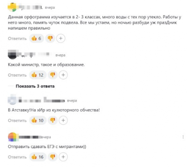 В соцсетях, впрочем, оплошности министра воздали должное, раскритиковав чиновника в пух и прах. Кто-то даже предложил отправить Кравцова пересдавать экзамены по русскому языку вместе с мигрантами. Другие комментаторы заметили, что, возможно, вскоре нас ждут грядущие изменения в правилах русского языка, и букву "да" в слове "праздник" после такого конфуза упразднят.