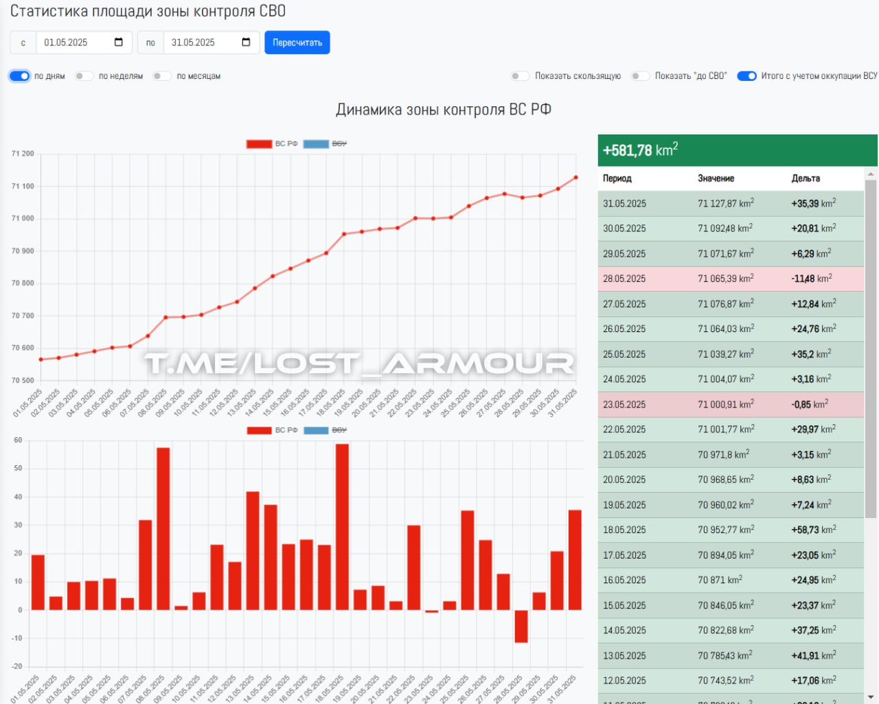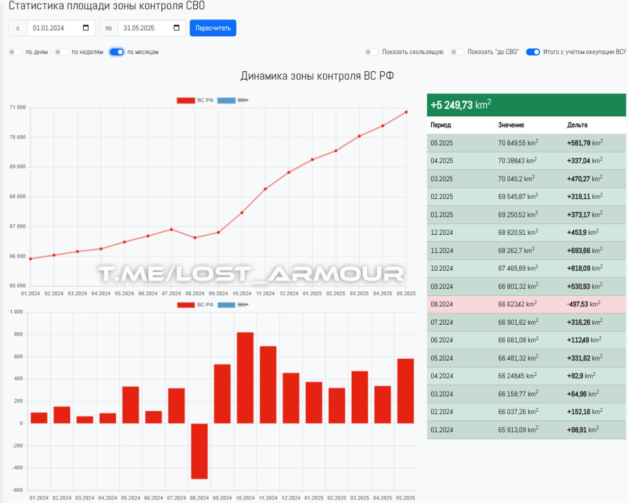 За май 2025 ВС РФ освободили свыше 580 км² территории в зоне СВО, продемонстрировав лучший темп продвижения с ноября 2024 года.