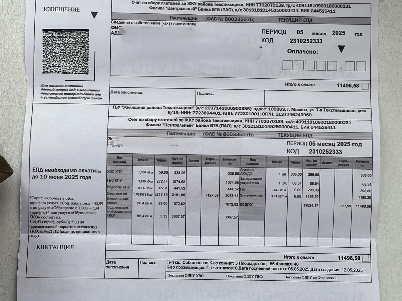 По нашим подсчётам, средняя стоимость коммунальных услуг за трёхкомнатную квартиру в Москве составляет 11 100 рублей. Выше представлено фото квитанции за май 2025 года.
