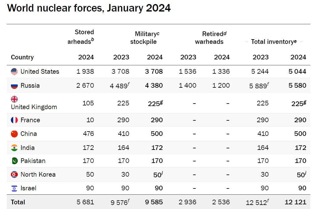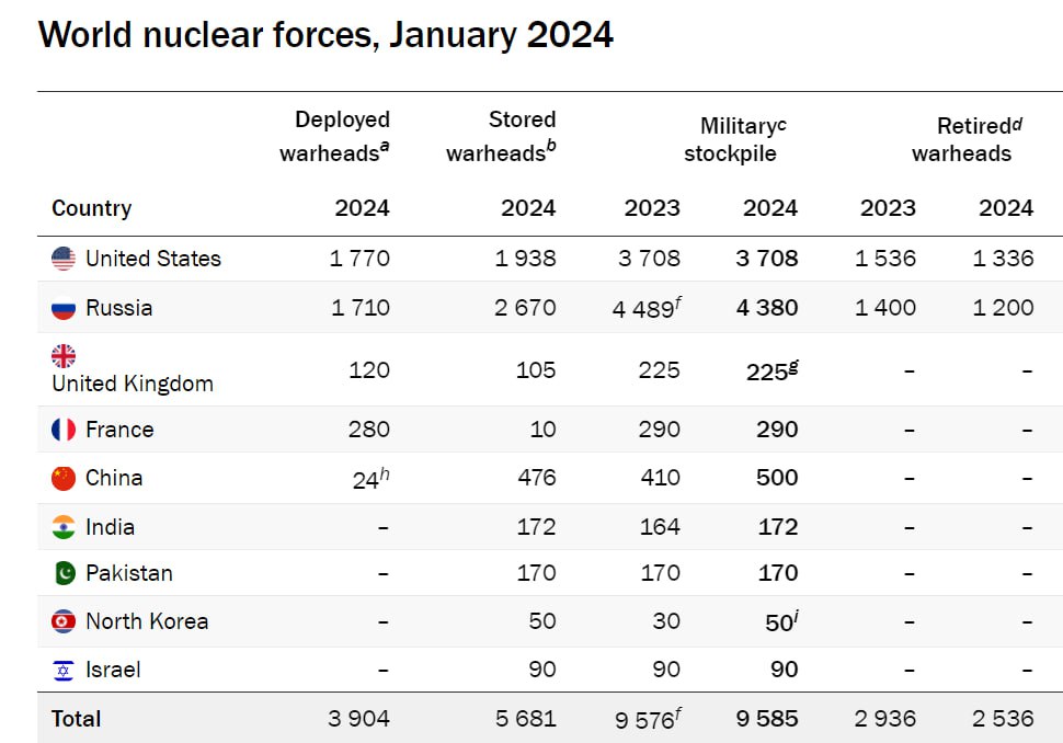 Состояние ядерного потенциала стран с ядерным оружием на январь 2024 г.