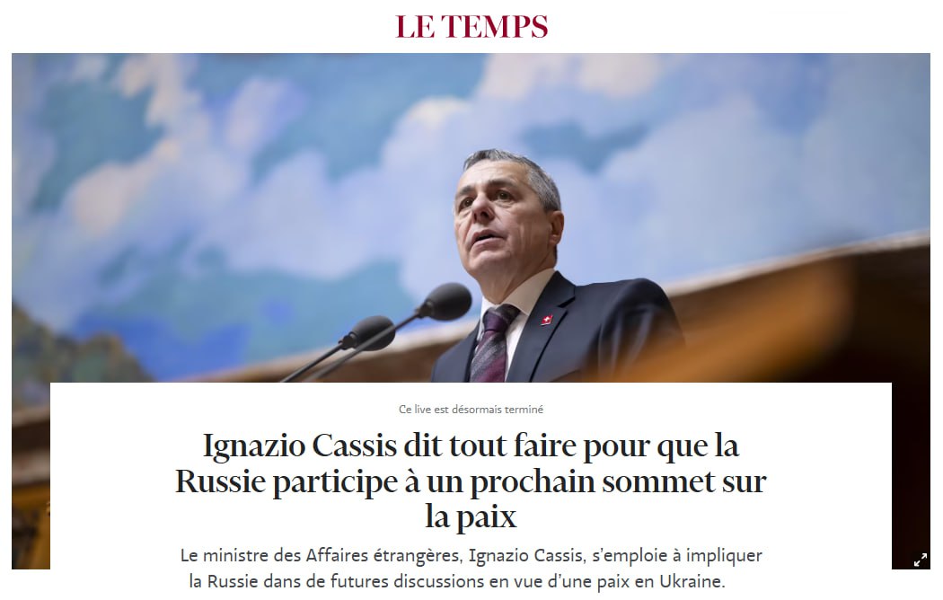 Власти Швейцарии намерены добиться участия РФ во втором «мирном саммите», заявил глава МИД Иньяцио Кассис