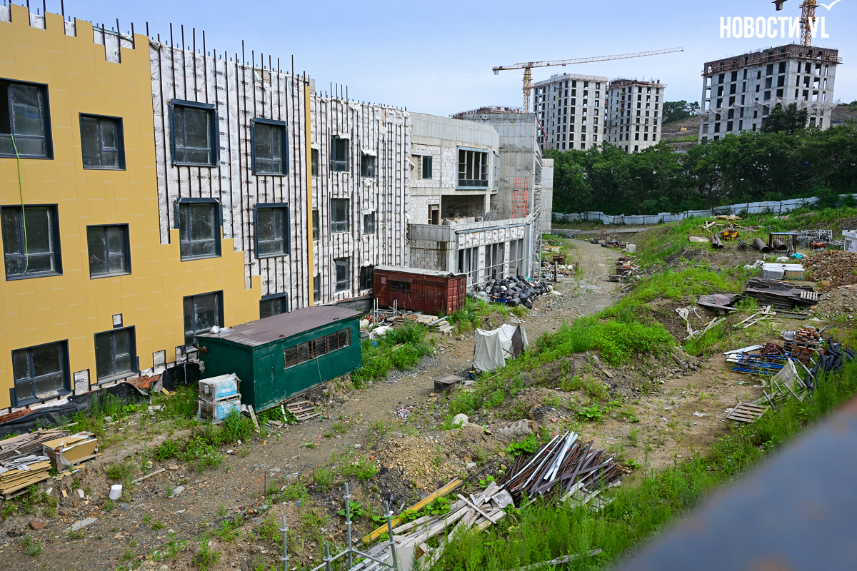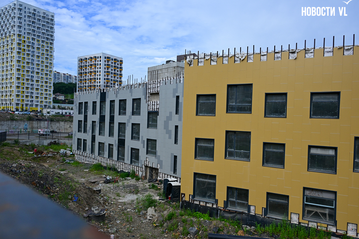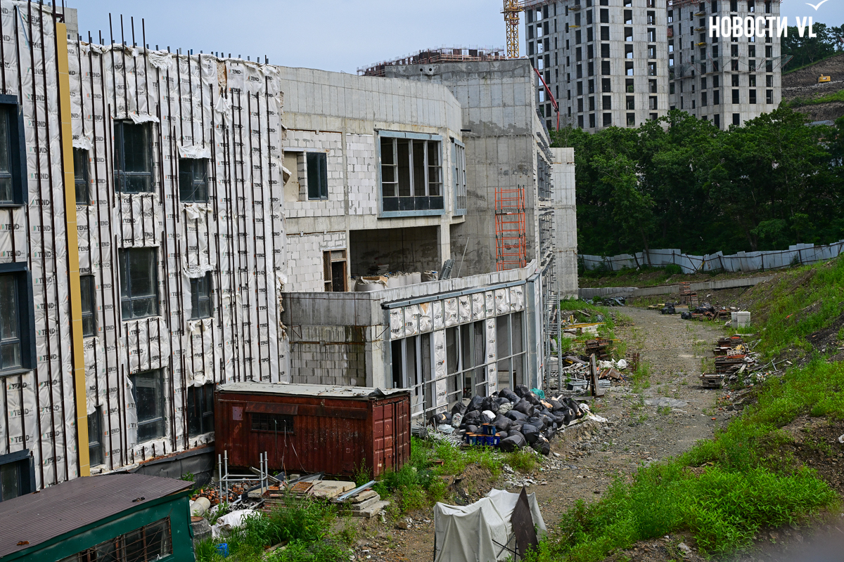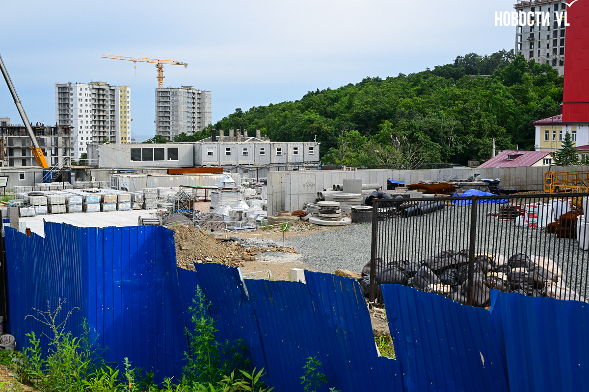 Школа строится очень неспешно. В начале года губернатор и глава Владивостока намеревались проводить еженедельные обходы строящихся объектов и даже пару раз заглянули в будущее образовательное учреждение. Каждый раз говорили о наращивании темпов, но в последний раз новости со школы от губернатора были в апреле, а от мэра – вообще в январе. Сегодня фотограф Новостей VL обошёл всю строительную площадку и не увидел там ни единой работящей души, только охранника.