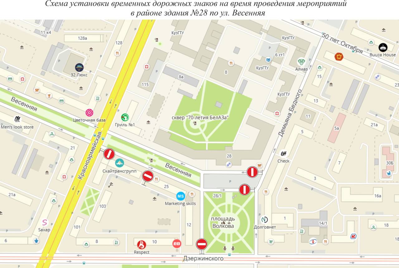 С 7:00 до 14:00 понедельника, 2 сентября, на площади Волкова, улице Весенней на участке от Красноармейской до Демьяна Бедного и проездах вдоль парковки у главного корпуса КузГТУ по улице Весенней, 28 будет ограничено движение.