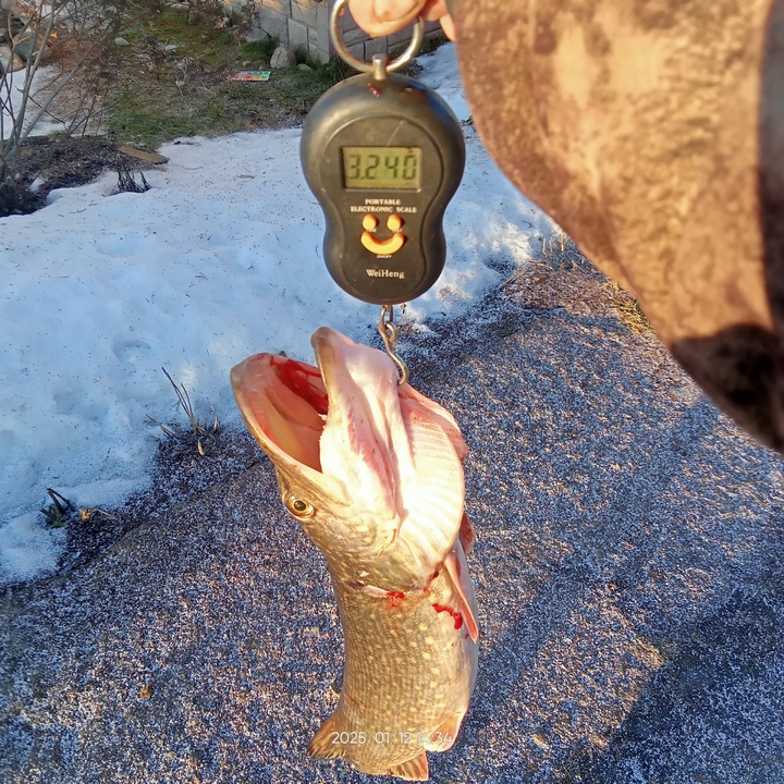 Богатый улов в 11 рыб величественно разложили на льду. Несмотря на такое количество, вес рыбы достиг всего девяти килограммов, но одна из щук весит больше 3 килограммов.