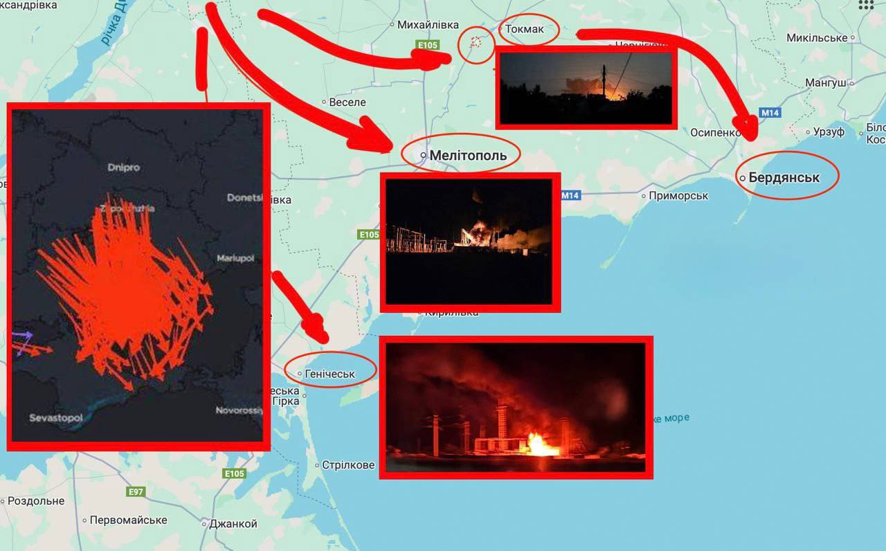 ▫️В частности, в Мелитополе и Геническе уничтожены подстанции, обеспечивающие питание, в том числе военной инфраструктуры. В Молочанске выведена из строя подстанция, а в Токмаке нанесён удар по складу боеприпасов.