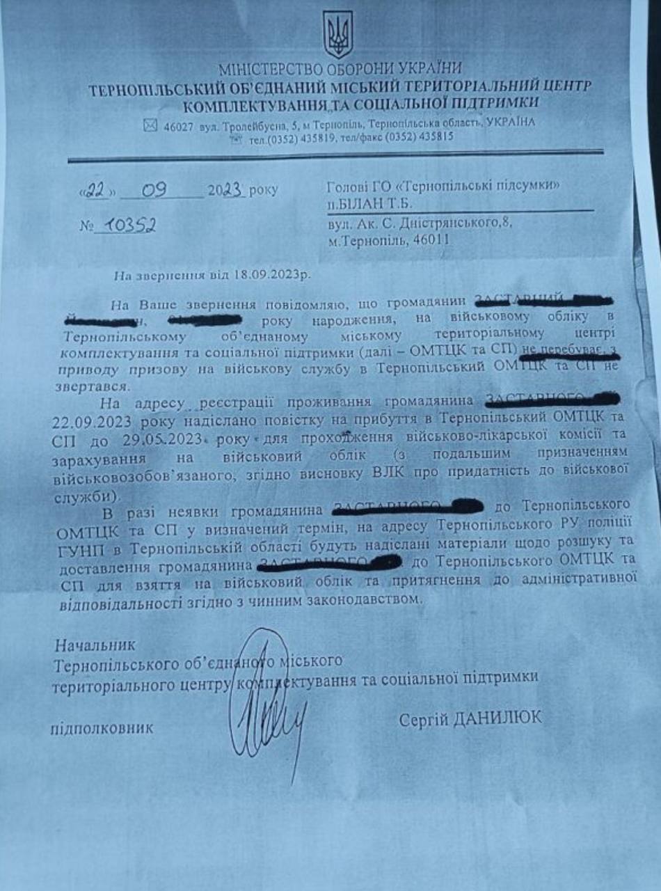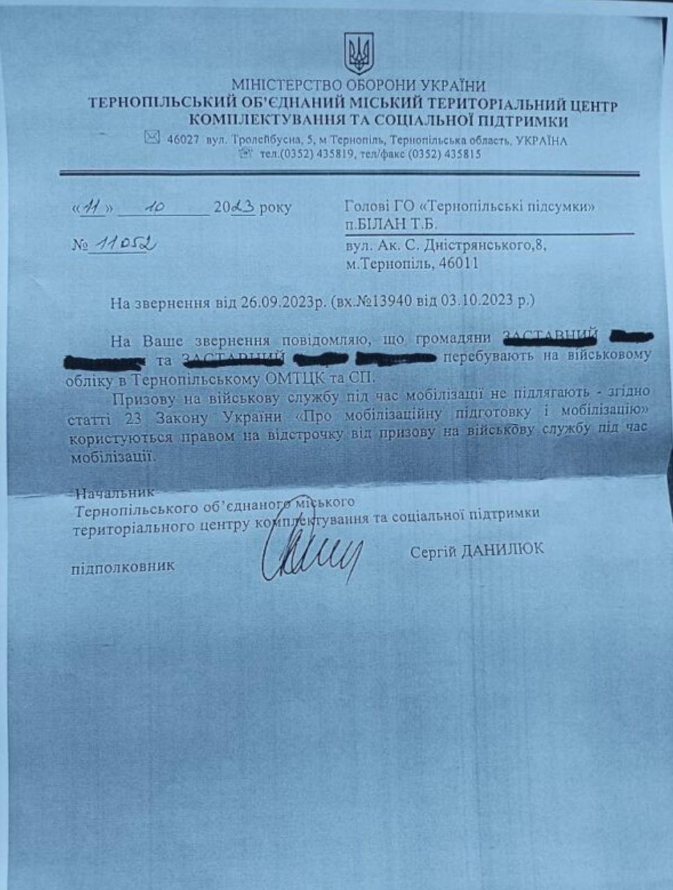 Он сообщил, что ему ответили. Так, экс-мер Тернополя Роман Заставный на учете в военкомате не состоит. А насчет его родственников, оказывается, что рестораторы особенно ценны для Украины. Призыву на военную службу во время мобилизации не подлежат (письмо №11052 от 11.10.2023 г.) и пользуются правом на отсрочку от призыва во время мобилизации. То есть до конца военного времени.