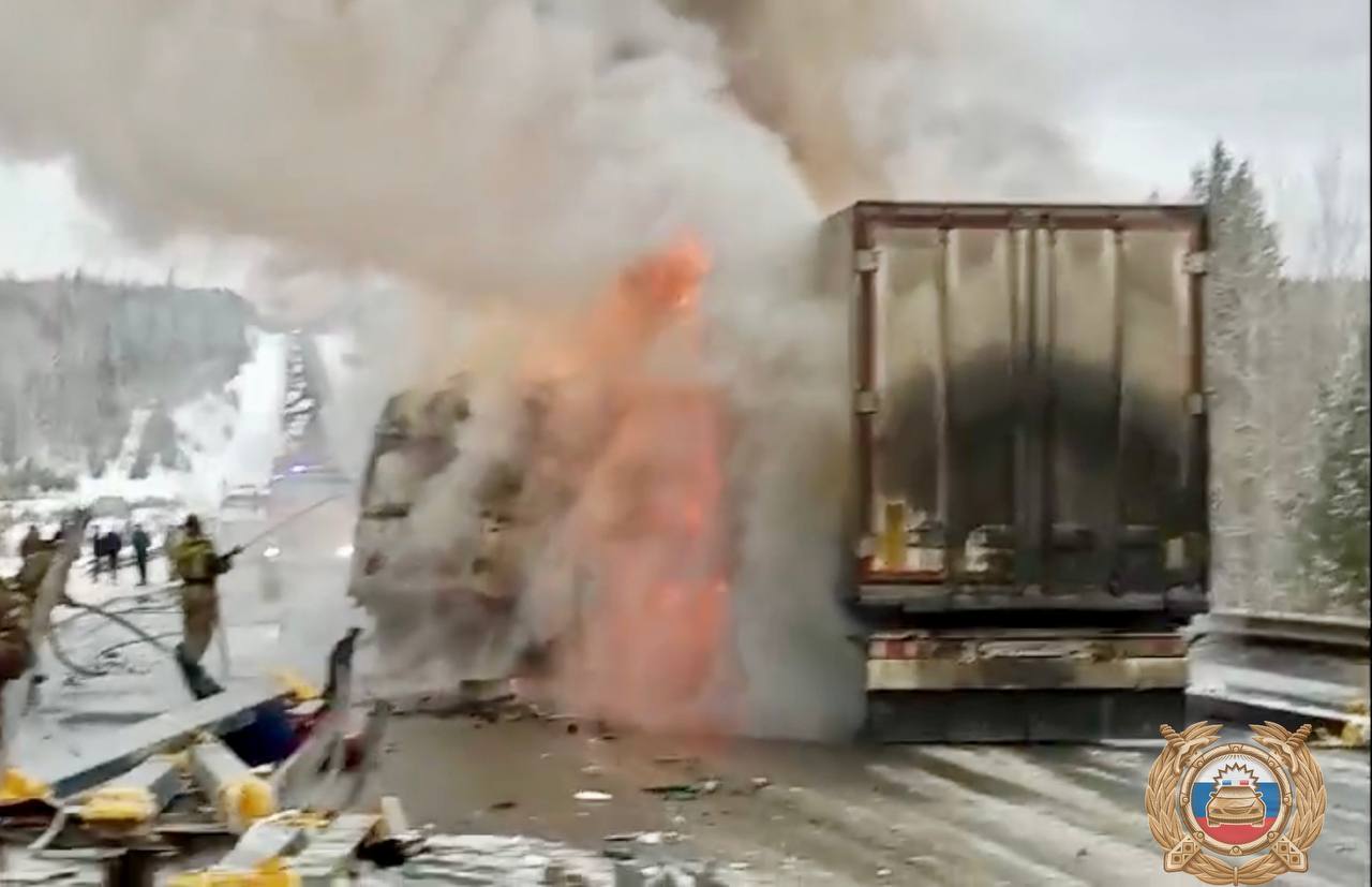 ❗️Три большегруза столкнулись и загорелись на трассе Р-255 «Сибирь» вблизи поселка Алзамай