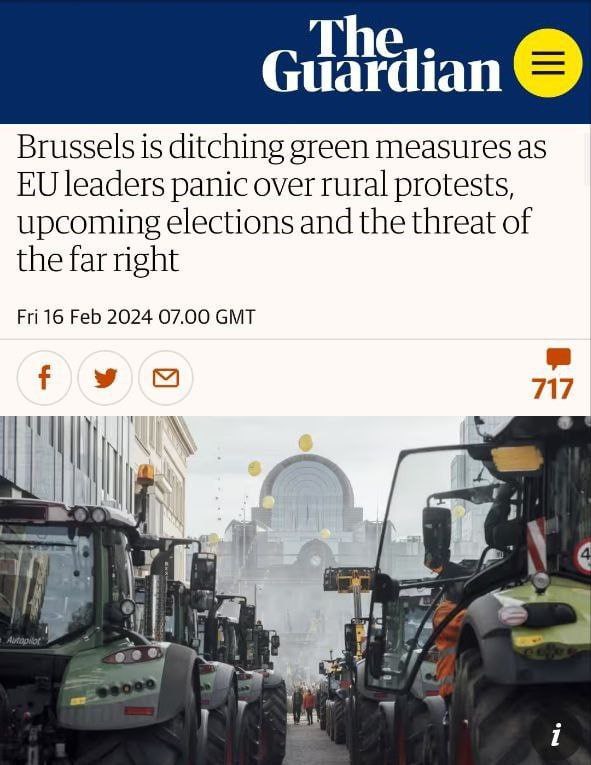 "Брюссель отказывается от "зеленых" мер, поскольку лидеры ЕС паникуют из-за протестов фермеров, предстоящих выборов и угрозы ультраправых"