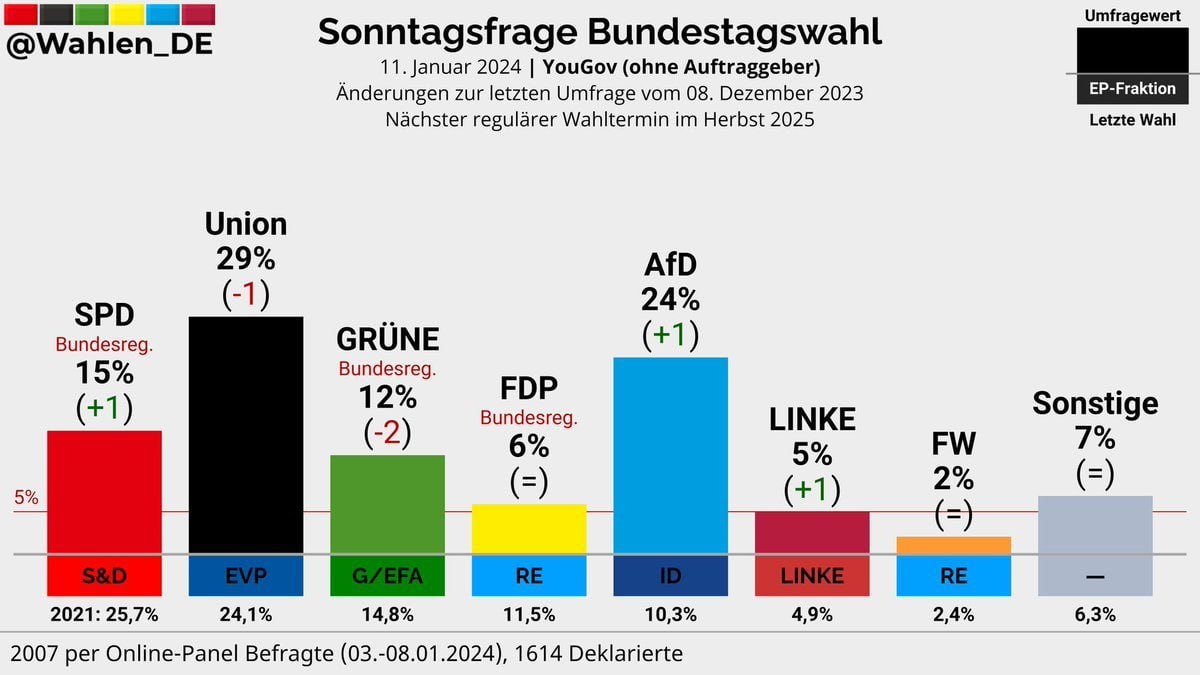 ❗️Рейтинги немецкой партии AfD (Альтернатива для Германии) достигли нового рекордного уровня, дойдя до 24% поддержки населения по стране — опрос YouGov