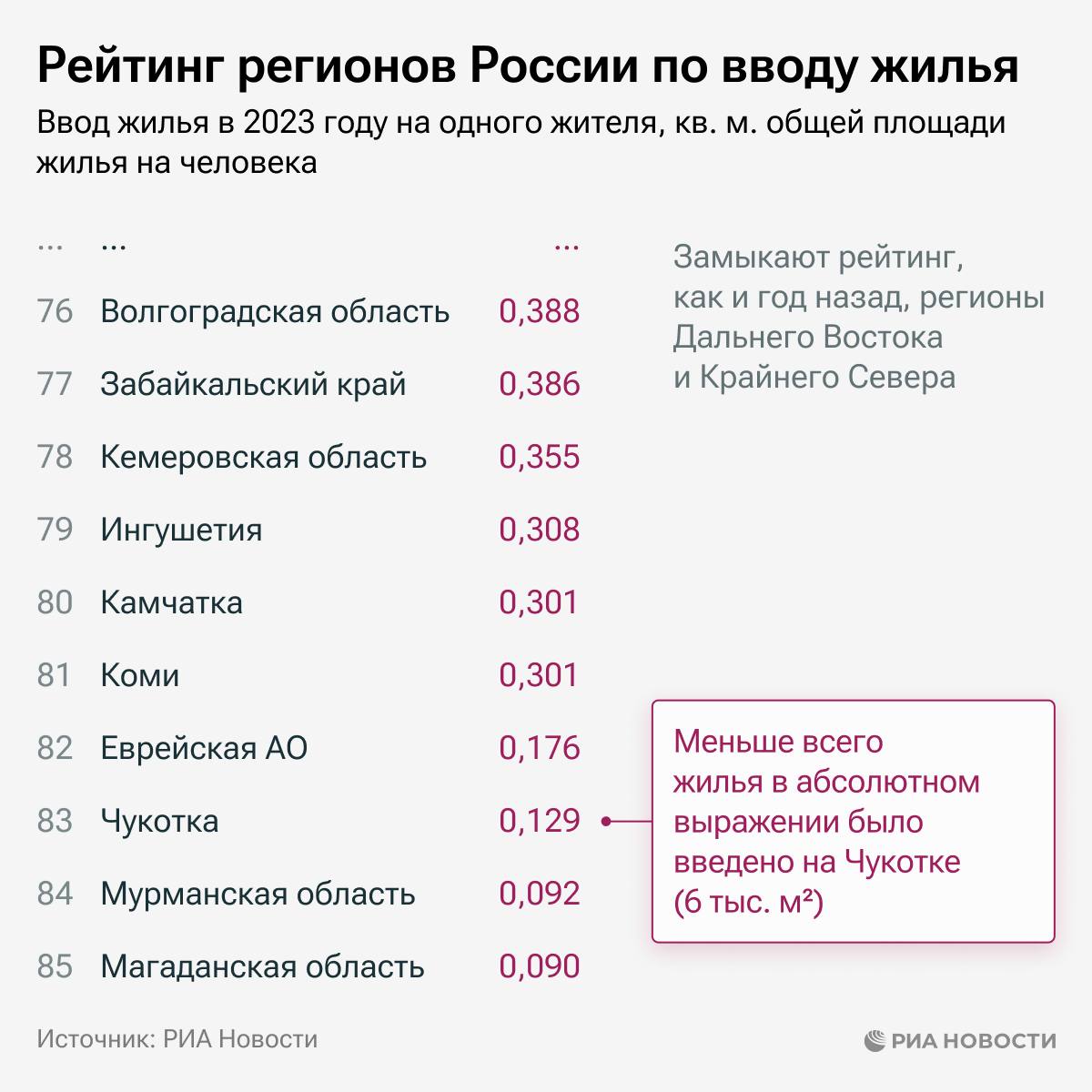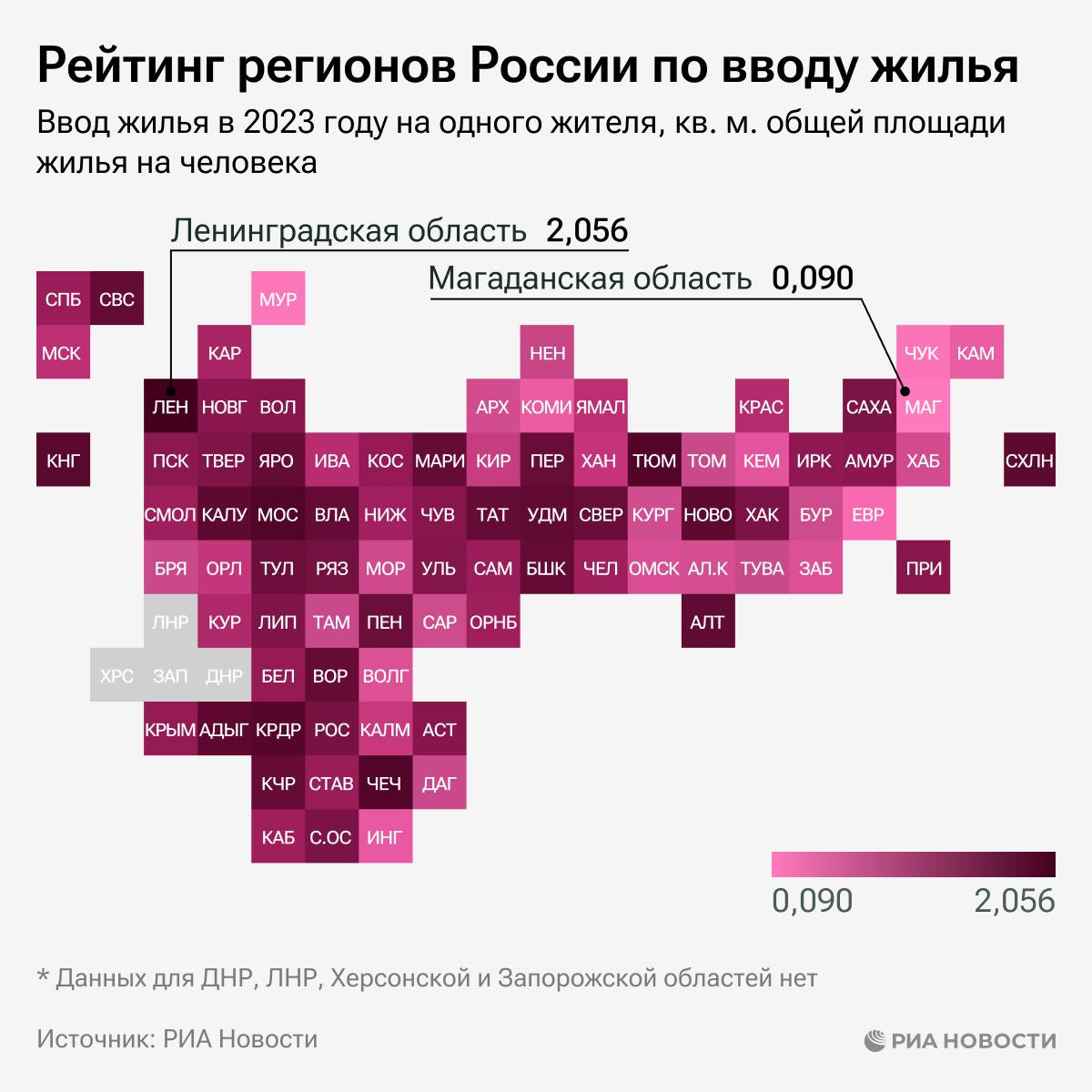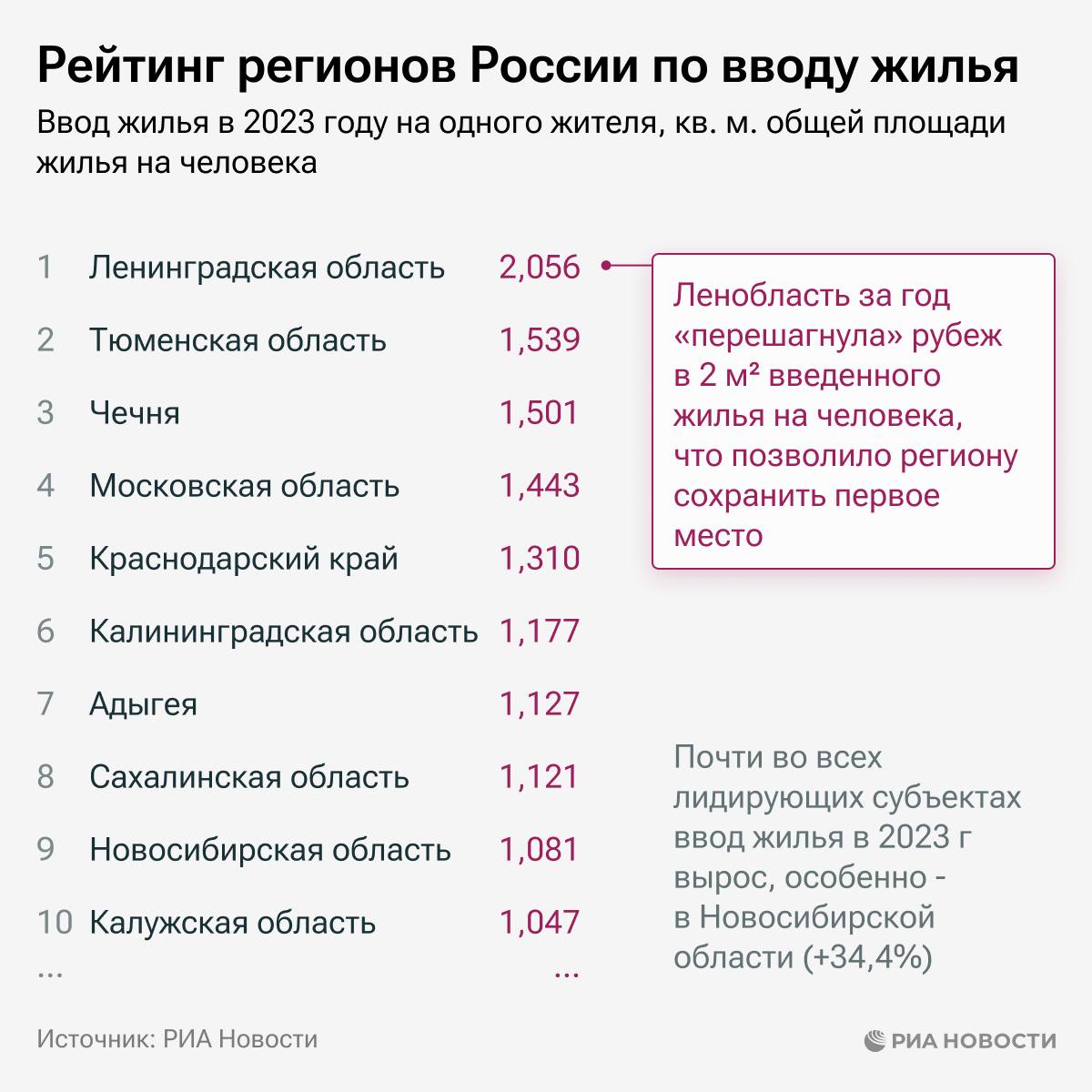 Ленинградская и Тюменская области, а также Чечня - лидеры в рейтинге регионов по вводу жилья на человека. В аутсайдерах - Магаданская и Мурманская области, а также Чукотка.