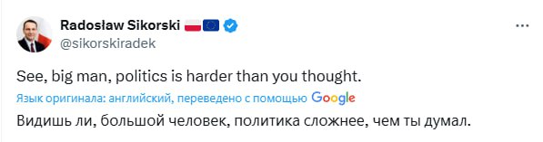 «Видишь ли, большой человек, политика сложнее, чем ты думал», – написал Сикорский на своей странице в соцсети.
