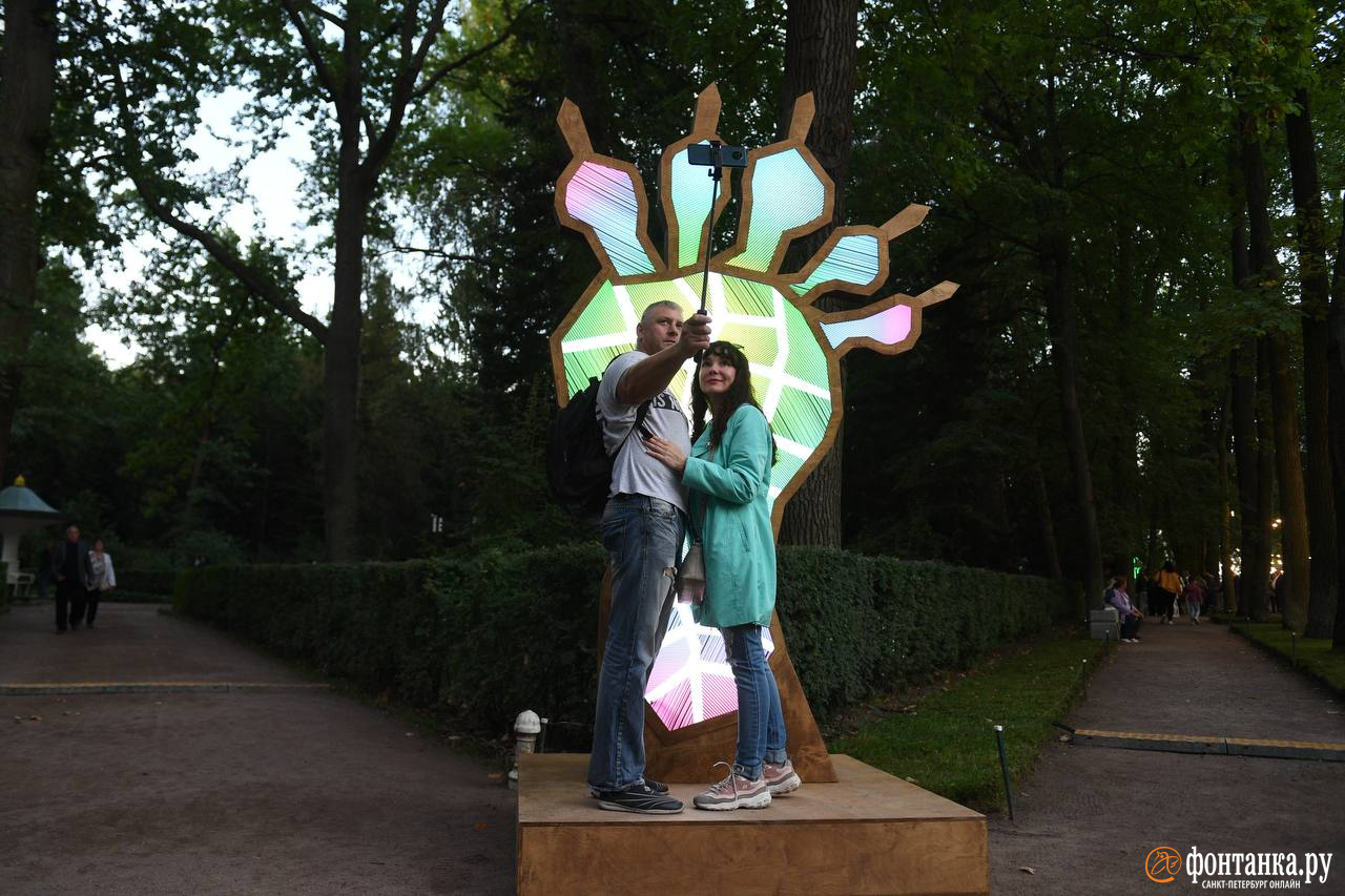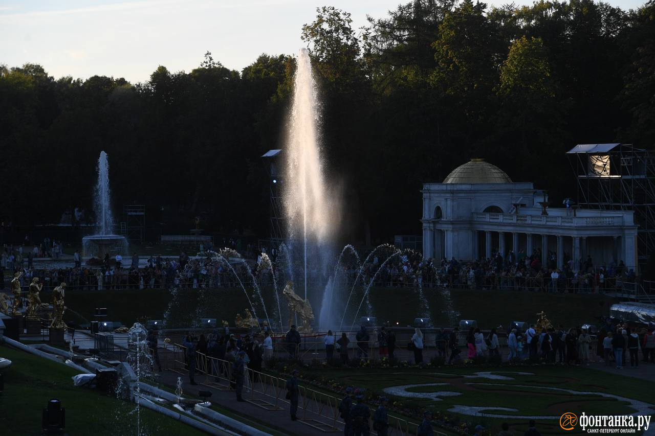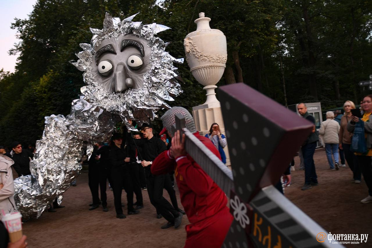 Ежегодный Осенний праздник фонтанов Петергофа, расширившийся в этом году до двухдневного праздника на всем пространстве Нижнего парка, принял первую часть зрителей. Пятничным вечером 20 сентября они гуляли по дорожкам — сначала при закате, а потом и в сумерках, разглядывая инсталляции в фонтанах и героев на дорожках.