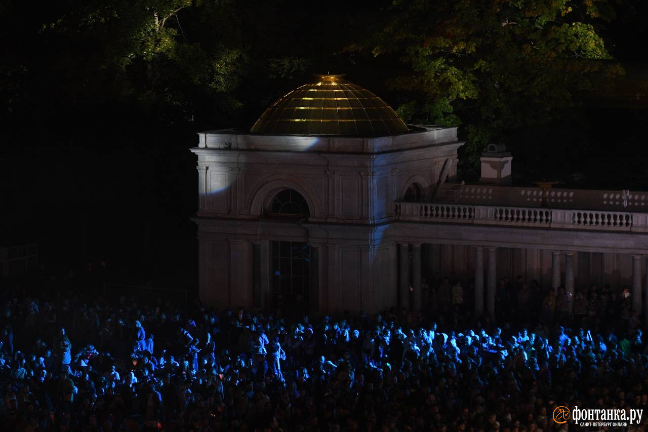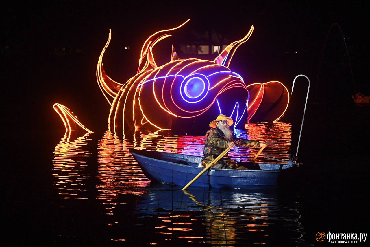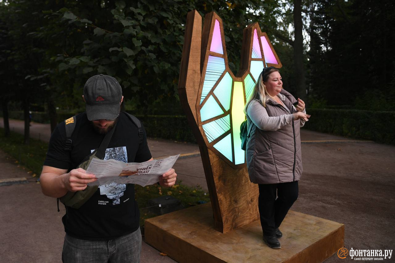 Ежегодный Осенний праздник фонтанов Петергофа, расширившийся в этом году до двухдневного праздника на всем пространстве Нижнего парка, принял первую часть зрителей. Пятничным вечером 20 сентября они гуляли по дорожкам — сначала при закате, а потом и в сумерках, разглядывая инсталляции в фонтанах и героев на дорожках.