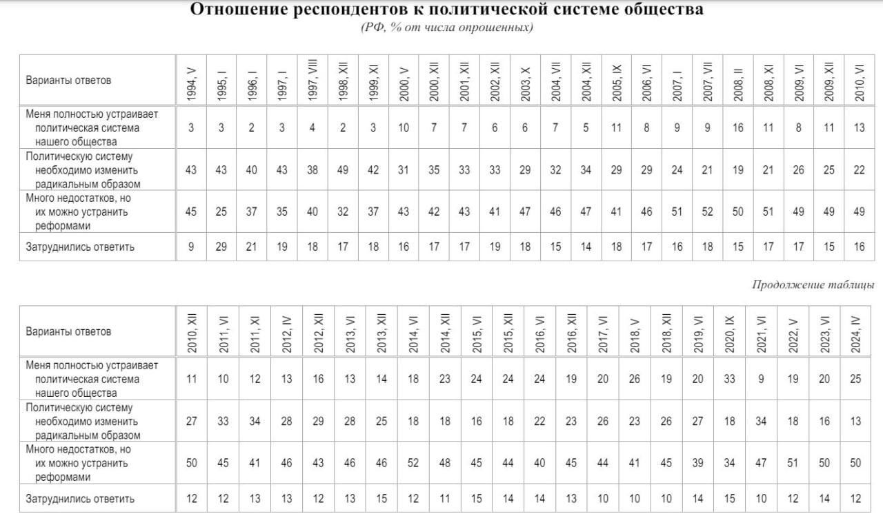 В апреле 2024 года 25% россиян ответили, что их всё устраивает в Системе (выше оценка в 33% была в сентябре 2020 года). И 13% ответили, что Систему надо менять радикальным образом – такой малой доли недовольных ещё не было за всё время наблюдения с 1994 года.