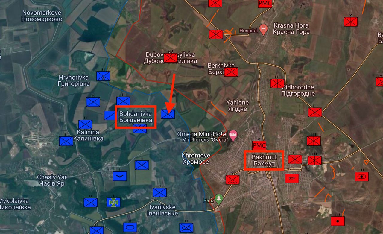 На северном фланге Артемовска наши войска наступают на противника, выбивая ВСУшников с опорных пунктов. Так, бойцы Северного флота, ВДВ и добровольческого корпуса выбили врага из лесополос от Артемовского до Богдановки и зашли на окраины поселка. Передовые подразделения находятся в 100 метрах от первых домов.