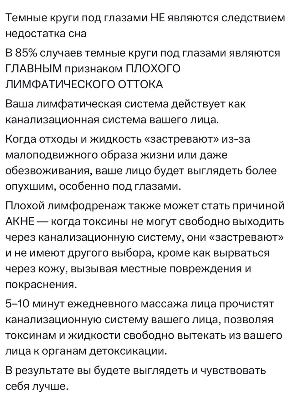 ▪️Лицо: Мягкими движениями кончиков пальцев массируйте лицо от центра к ушам и вниз к шее. Уделите особое внимание области под глазами, массируя ее от внутреннего уголка глаза к внешнему.