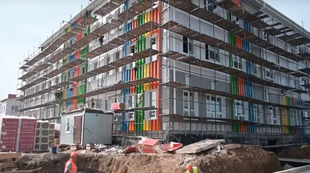 Сейчас на объекте монтируют электрооборудование, проводят работы на кровле и фасаде. Будущий образовательный комплекс уже подключен к инженерным коммуникациям. Полностью смонтирована и котельная. При строительстве используются материалы только отечественных производителей.