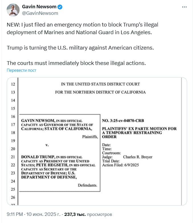 Также Ньюсом сообщил, что «подал экстренное ходатайство, чтобы заблокировать незаконное размещение Трампом морпехов и Нацгвардии в Лос-Анджелесе».