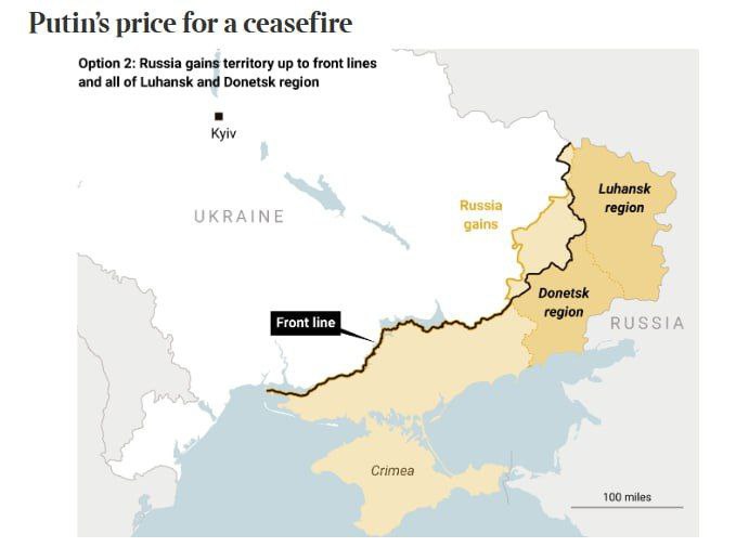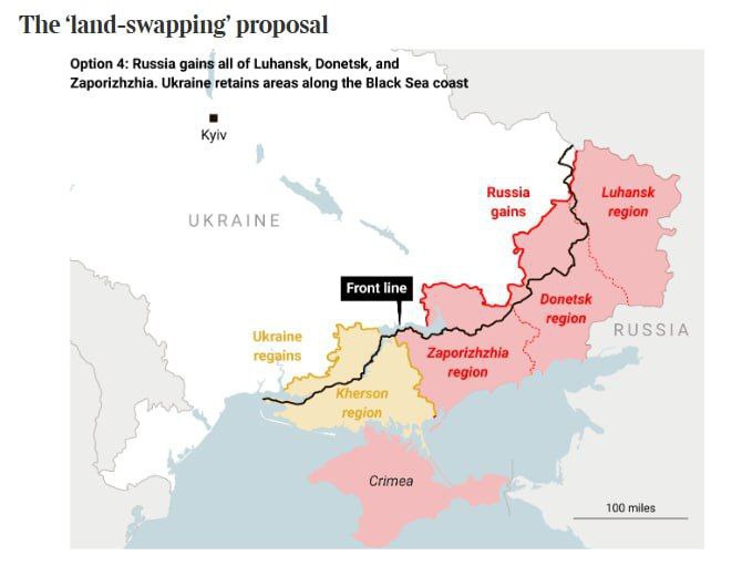 4. Территориальный обмен: Россия получает весь Донбасс, а Украина возвращает часть Херсонской области, хотя это маловероятно из-за ключевого значения Херсона для связи России с Крымом.