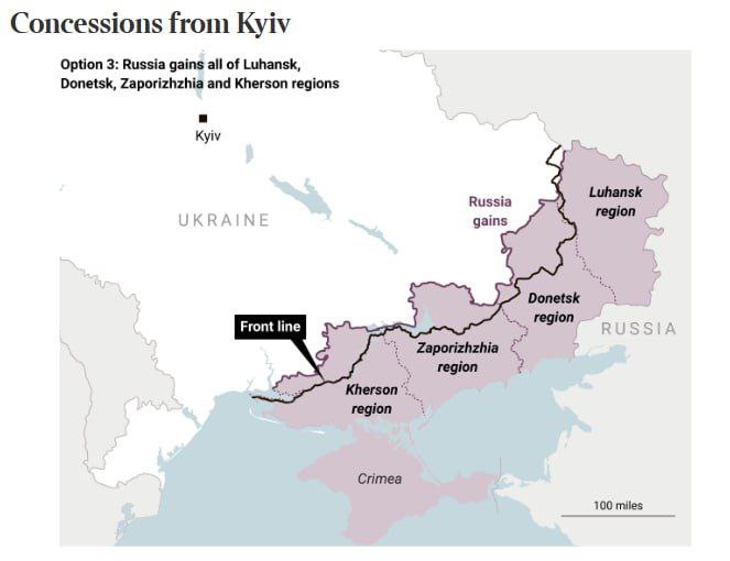 3. Значительные уступки Киева: Украина отдает России Луганск, Донецк, Запорожье и Херсон, включая территории, которые Россия еще не полностью контролирует.