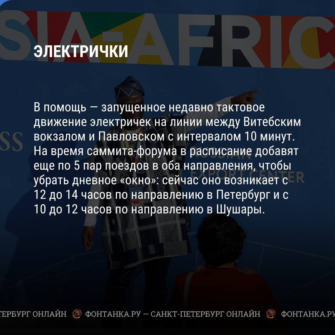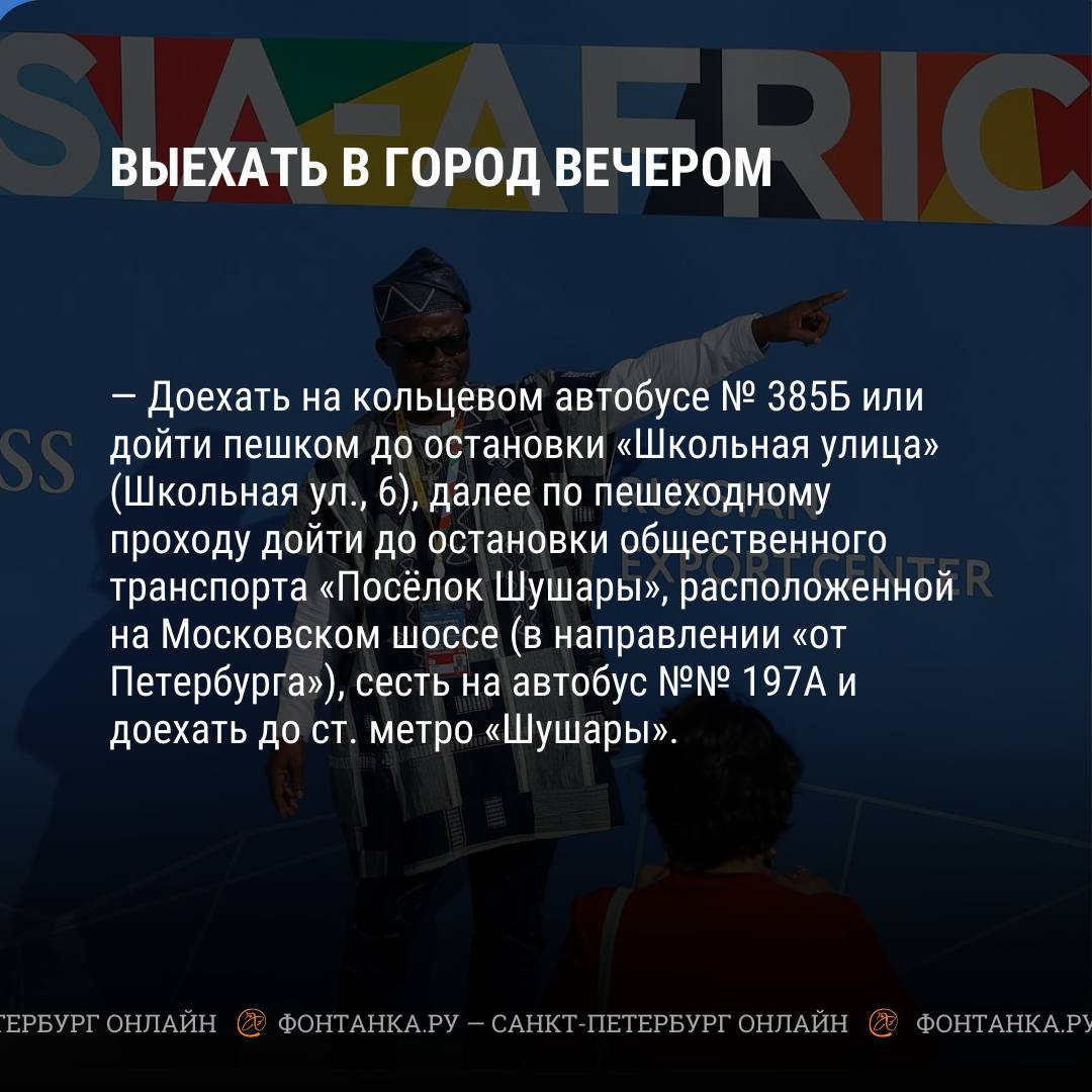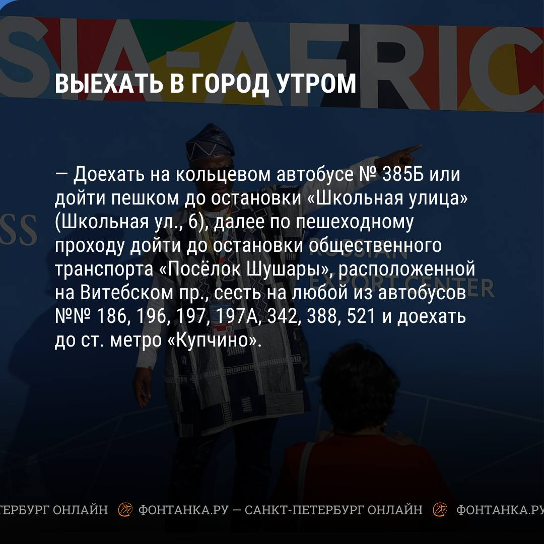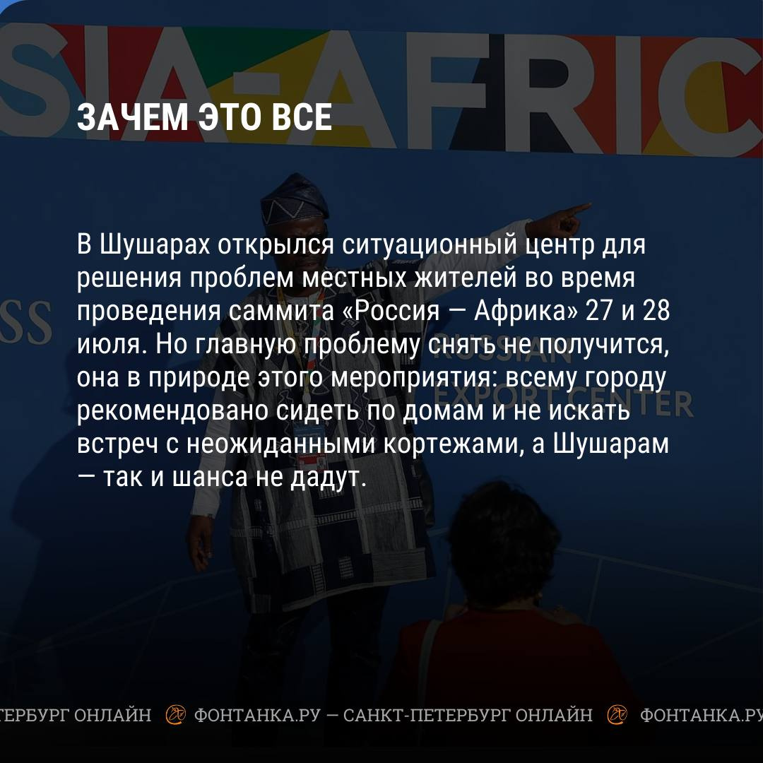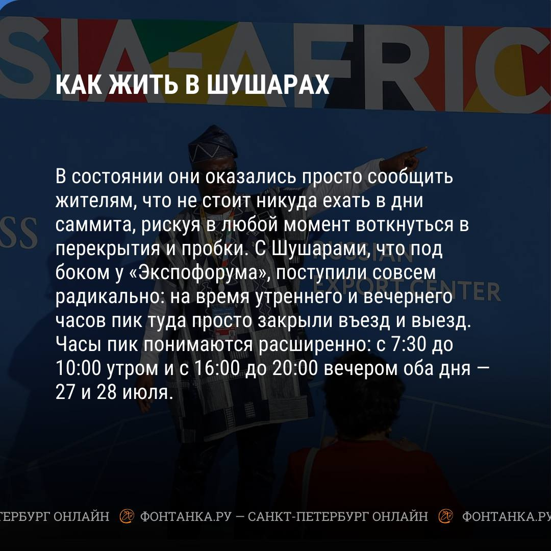 Город на Неве вступает в непростую неделю — экстраординарные предупреждения властей о подготовке к российско-африканскому саммиту создают ощущение беспрецедентности надвигающихся мер безопасности. Предприятиям рекомендовано перевести сотрудников на удаленную работу, запланированы серьезные ограничения движения, больницы переведены в режим круглосуточной готовности, а жителям прилегающих к основной площадке форума Шушар, кажется, вообще лучше не выходить из дома в эти дни.