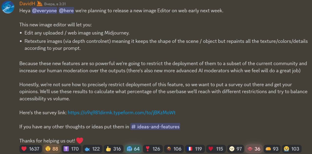 Midjourney выпускают новый визуальный редактор. Загрузить можно будет любое изображение из интернета, без ограничений.