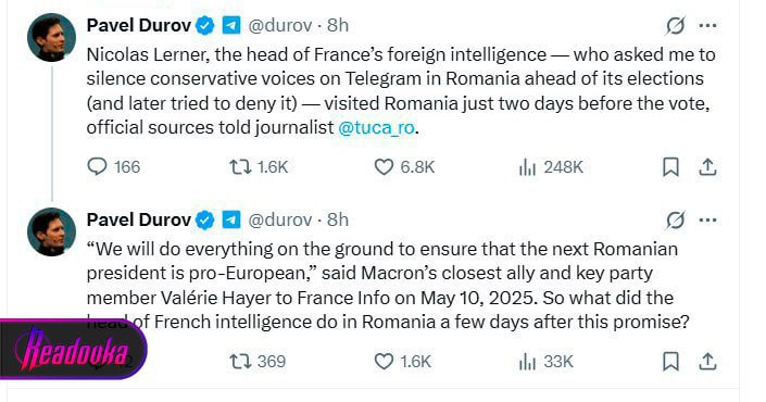 Павел Дуров со ссылкой на свои источники утверждает, что руководитель внешней разведки Франции Николя Лернер посещал Румынию за 2 дня до начала местных выборов, на которых в итоге победил прозападный кандидат. В страну французский представитель прибыл сразу после громкого заявления союзницы Макрона о всевозможной работе на местах для гарантии победы на выборах «проевропейски настроенного следующего президента». Основатель Telegram продолжает изобличать откровенное вмешательство ЕС в румынские электоральные процессы. Ранее, по словам Дурова, Лернер лично требовал от него цензуры консервативной части местного политикума, на что получил отказ.