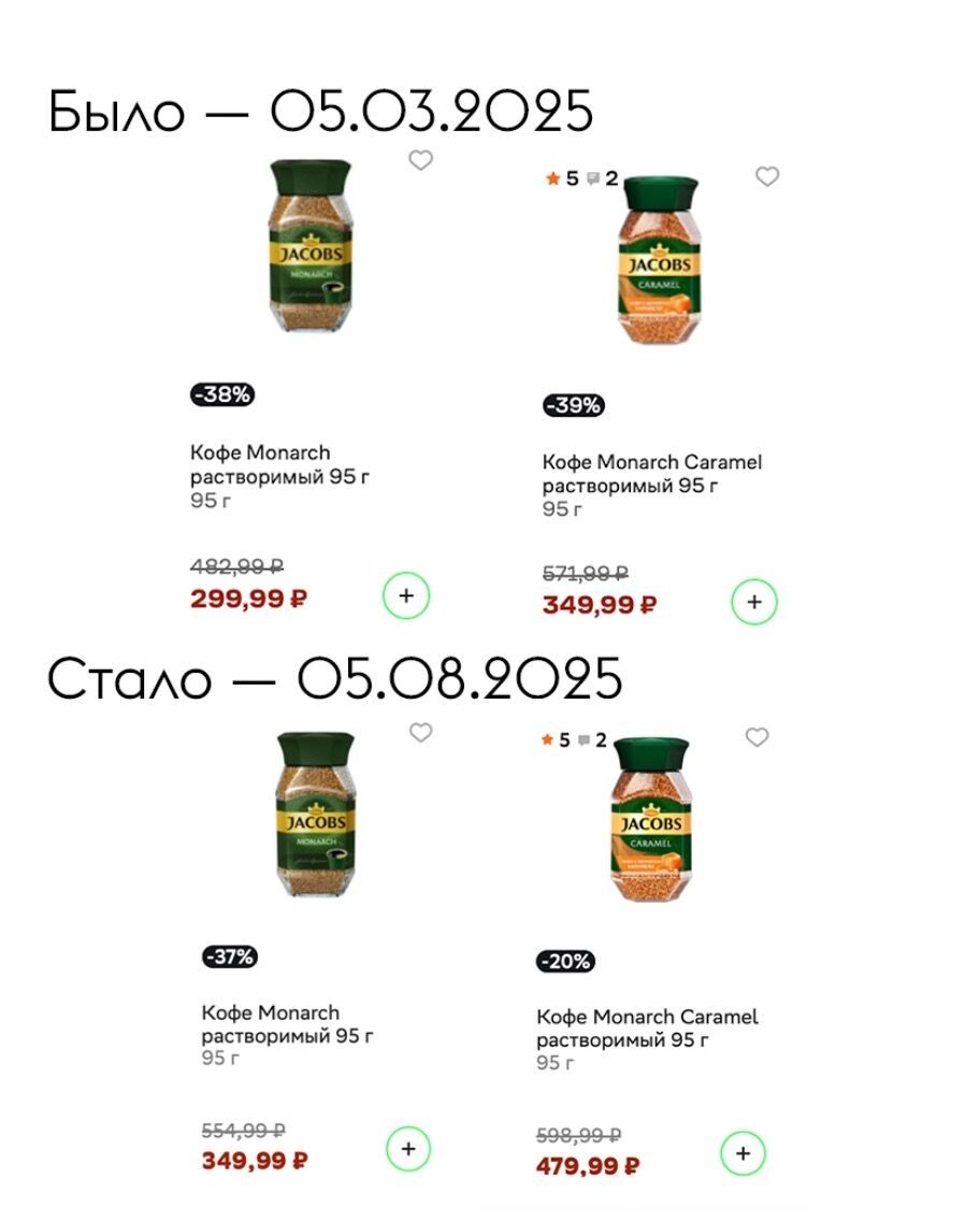 Например, банка растворимого кофе Monarch весом 95 граммов стоила 299,9 рубля со скидкой (482,9 рубля без скидки), а теперь стоит 349,9 рубля (554,9 рубля без скидки). Такая же банка кофе Monarch Caramel подорожала с 349,9 рубля (571,9 рубля без скидки) до 479,9 рубля (598,9 рубля без скидки).