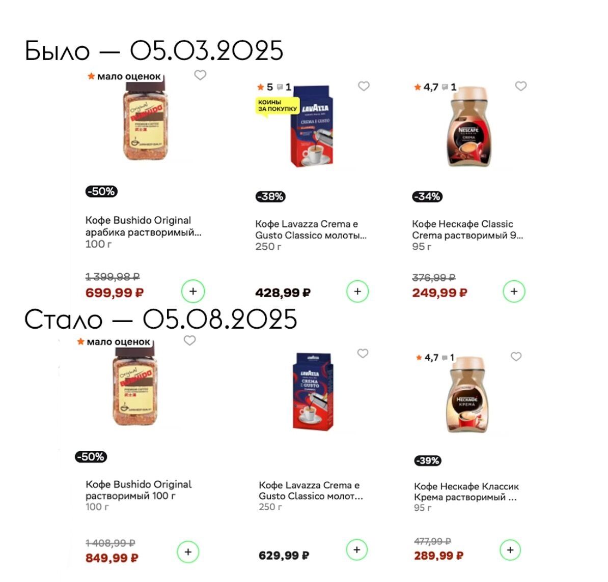 Кофе Lavazza Crema e Gusto Classico весом 250 граммов подорожал с 428,9 рубля до 629,9 рубля. Кофе Нескафе Classic Сremа весом 95 граммов стал стоить 289,9 рубля (477,9 рубля без скидки) вместо 249,9 рубля (376,9 рубля без скидки).