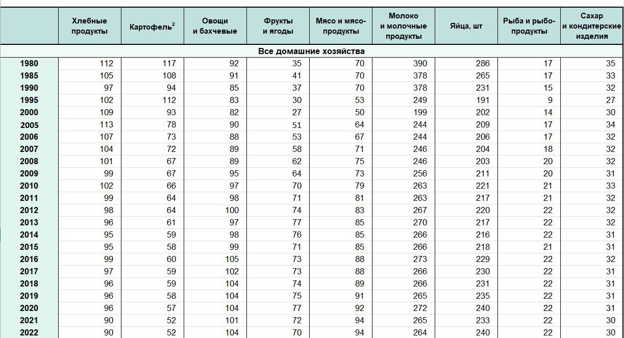 Рост потребления мяса и фруктов говорит о росте благосостояния (это константа для всех стран), об этом же говорит и снижение потребления углеводов (хлеба и картошки). И по мясу и фруктам мы видим улучшение жизни россиян за последние двадцать лет. Яиц, кстати, тоже стали есть больше (на 40 штук в год).