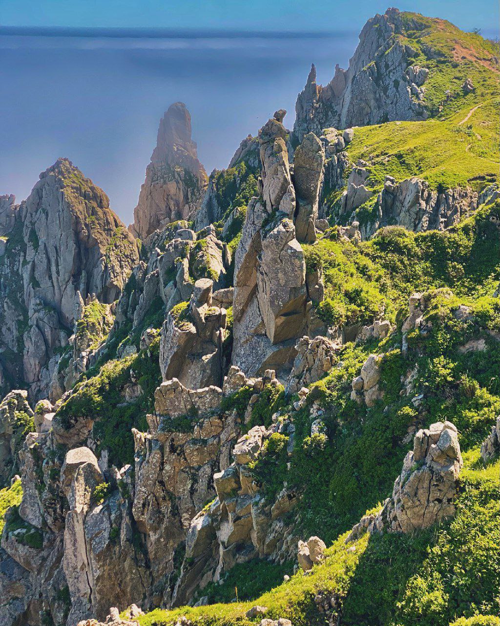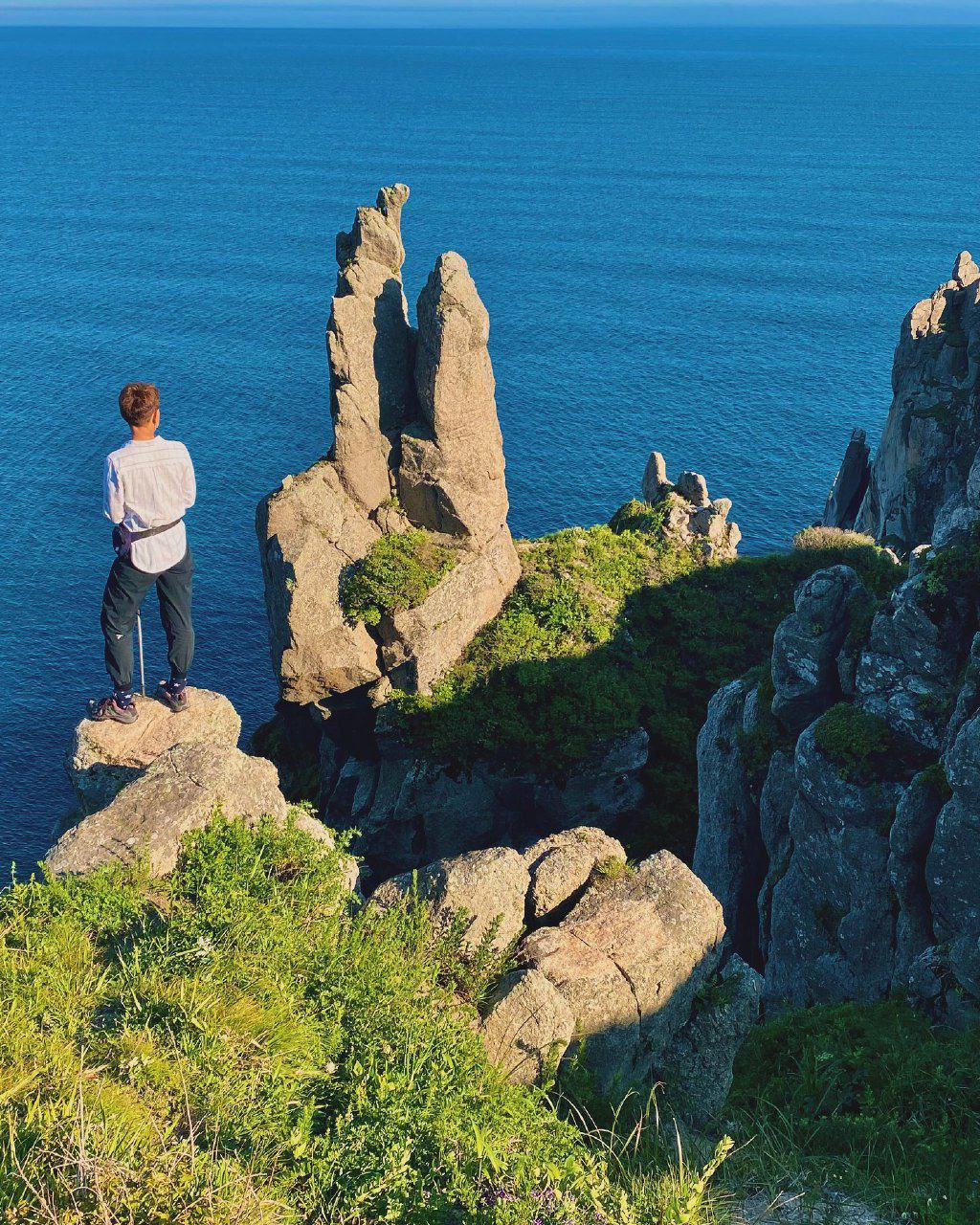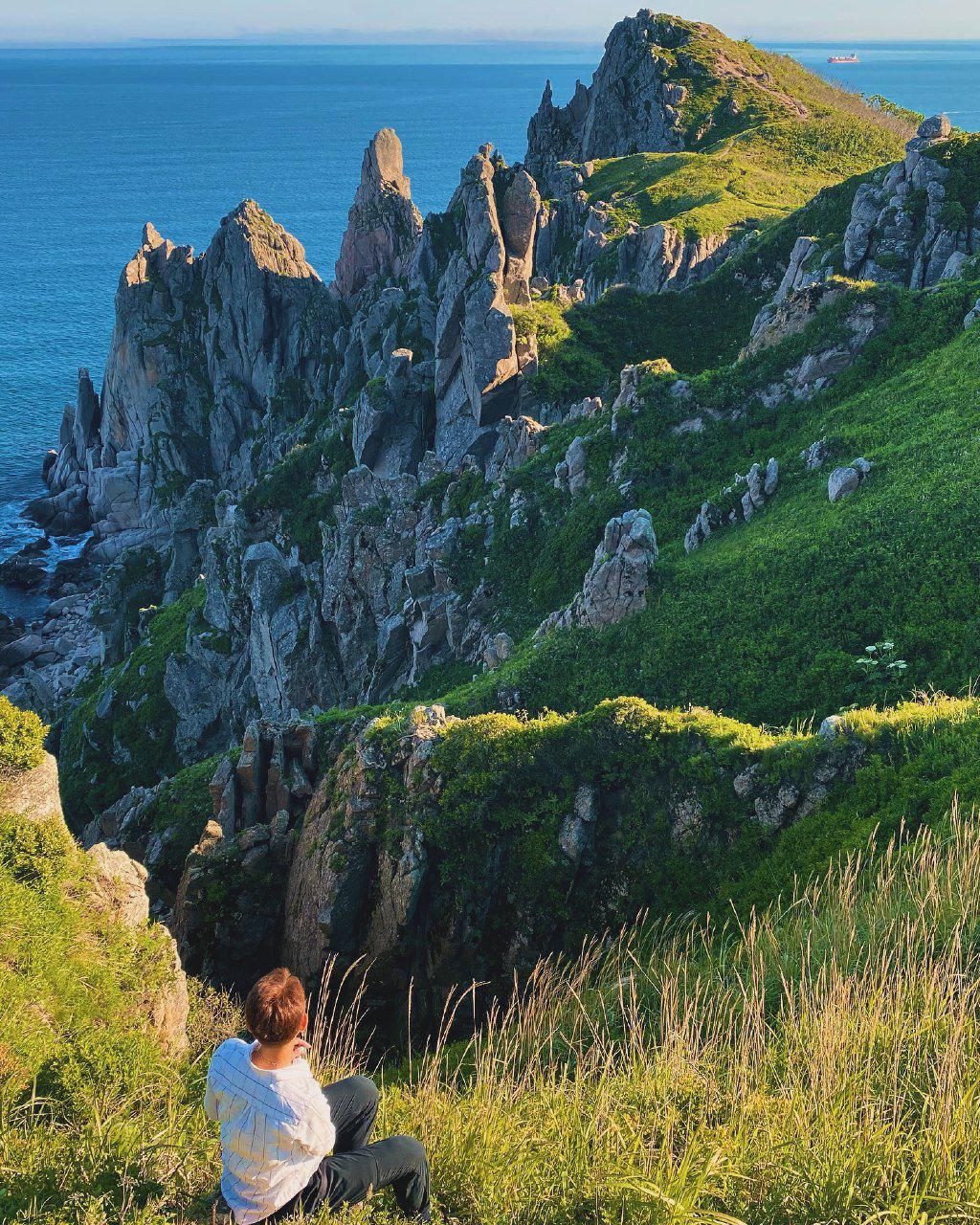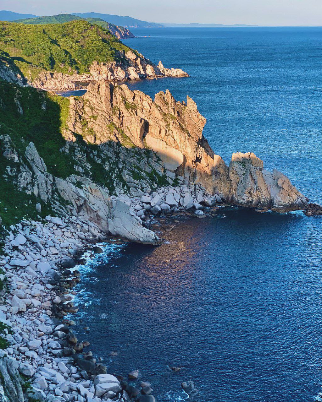 Южная сторона мыса открывает виды на бескрайние просторы Японского моря. Вдоль хребта раскиданы гигантские камни, смотровые площадки и обрывы. Этот мыс напоминает мыс Тобизина, но он намного больше а скалы выше. Особенно красиво здесь в солнечный летний день.