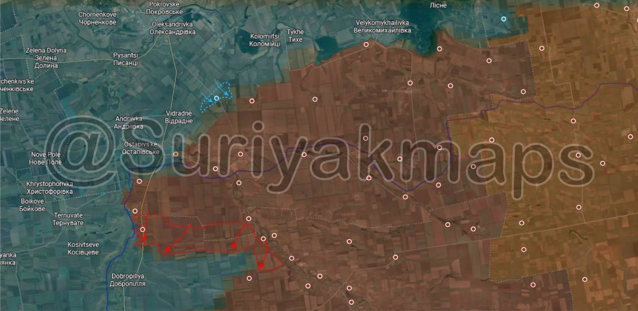Обстановка на Покровском направлении: российская армия продолжила закрепляться на восточном берегу реки Гайчур и захватила Новое Запорожье, а также ряд позиций от этого населенного пункта до Рыбного вдоль границы между Днепропетровской и Запорожской областями. Кроме того, украинские силы продолжили отход с восточной окраины Гуляйполя, что позволило российским войскам занять населенный пункт Зеленый Гай и прилегающие позиции, а также большую часть населенного пункта Высокое.