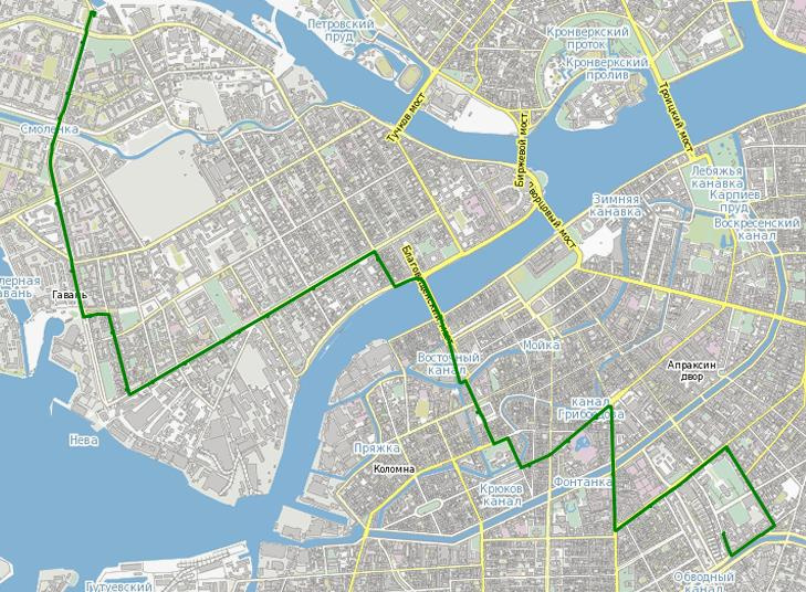 Общая протяженность маршрута тогда составляла 27,37 км, но он отличался от нынешнего: изначально автобус не заезжал на Кожевенную и не собирал посетителей Севкабеля», а выворачивал на Большой проспект В.О. За сутки — 63–66 рейсов в прямом направлении (в зависимости от того, выходной или будний день) и 66–70 в обратном. Судя по контрактным параметрам, интервал движения должен колебаться в течение дня примерно от 13 до 20 минут. О заезде на Кожевенную городские власти сообщили в начале 2024 года.