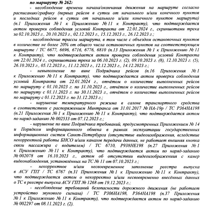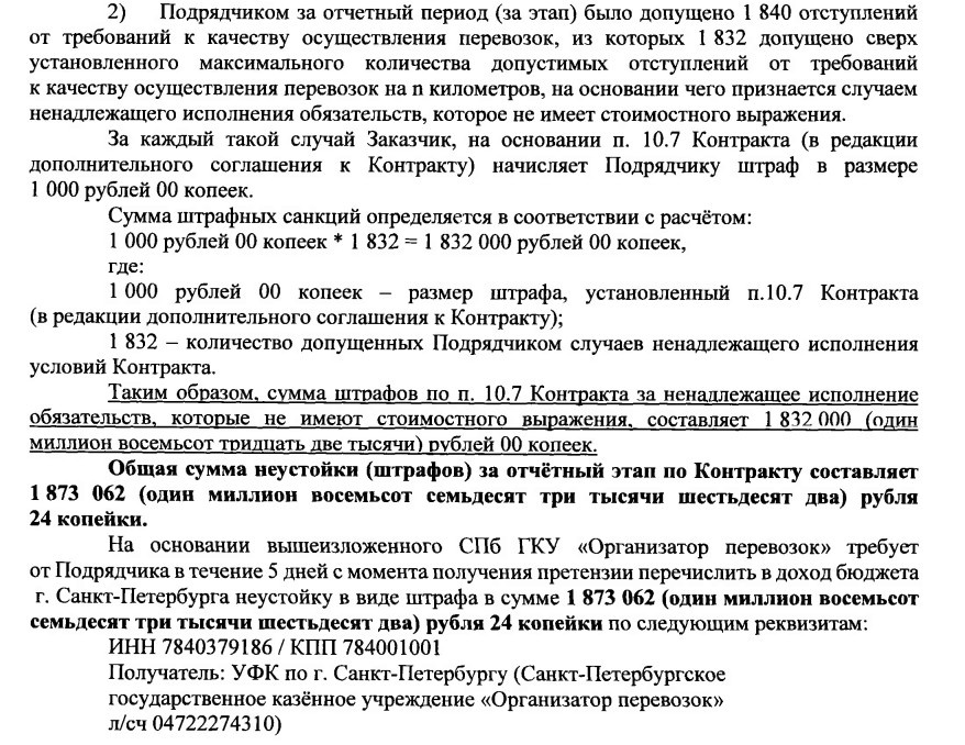 Судя по сайту госзакупок, проблем с этим маршрутом хватало. Например, за этап с октября по март подрядчику выставили штраф почти на 2 млн рублей. В претензии указаны и несоблюдение времени выхода на маршрут, и отклонение от него, и температурный режим. Но самое красноречивое — количество невыполненных рейсов с 1 октября до 31 декабря — 1 808, это львиная доля всех нарушений. Из акта исключили несколько проступков, которые не попадают в штрафуемый лимит (из того самого разрешенного максимума) и выставили претензии на 1,873 млн. За предыдущий период выставляли 650 тысяч (650 сорванных рейсов и один раз пойманный водитель с телефоном — за него как раз штрафовать не стали). И так далее.
