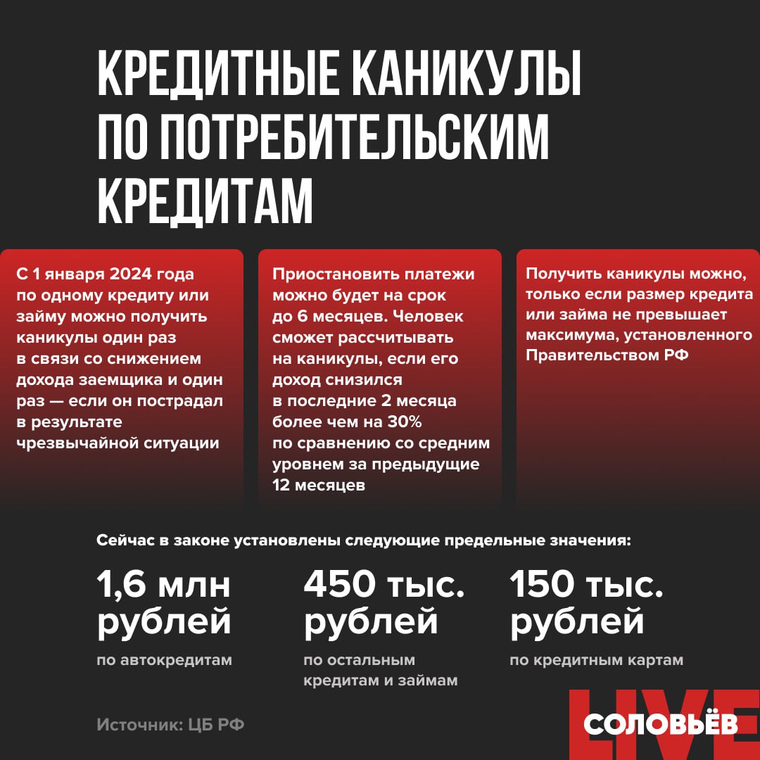 ❗️С 1 января 2024 года по одному кредиту или займу можно получить каникулы один раз в связи со снижением дохода заемщика и один раз — если он пострадал в результате чрезвычайной ситуации.
