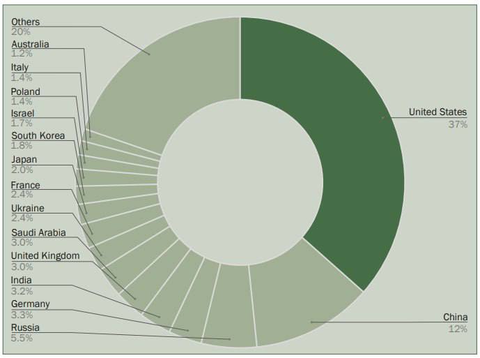 ✔️60% общемирового объема военных расходов пришлось на пять государств с крупнейшими военными бюджетами – США (37%), Китай (12%), РФ (5,5%), Германия (3,3%) и Индия (3,2%).