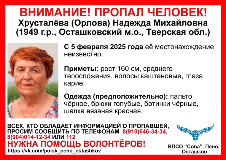 Пожилая женщина пропала 5 февраля. Уточнялось, что на ней были надеты черное пальто и брюки голубого цвета.