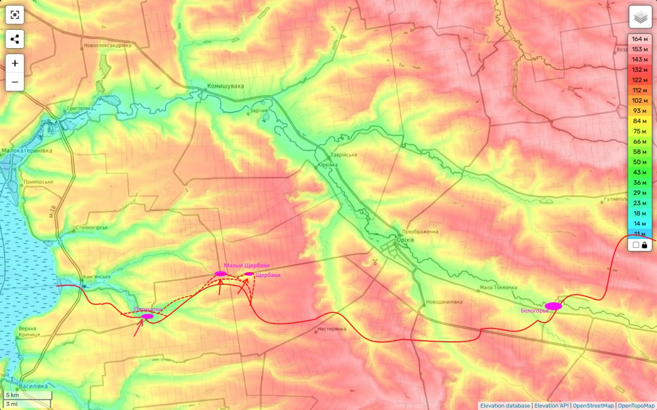 Таким образом очевидна серьезность намерений нашего командования прорвать здесь фронт противника. Вероятно ближайшей целью здесь будет охват Орехова с запада и огневое (дронами) перерезание путей снабжения Ореховской группировки противника.