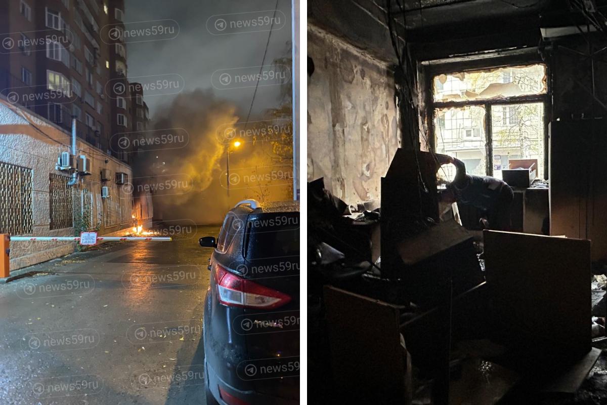 Слева — очевидец успел снять момент пожара. Справа — так сейчас выглядит обгоревший кабинет офиса партии