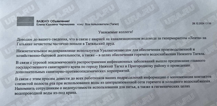 «Доводим до вашего сведения, что в связи с аварией на канализационном водоводе за гипермаркетом „Лента“ на Гальянке нечистоты частично попали в Тагильский пруд. Нижнетагильское водохранилище используется „Уралвагонзаводом“ для обеспечения производственной и хозяйственно-бытовой деятельности, а также в целях обеспечения горячего водоснабжения города», — следует из сообщения.