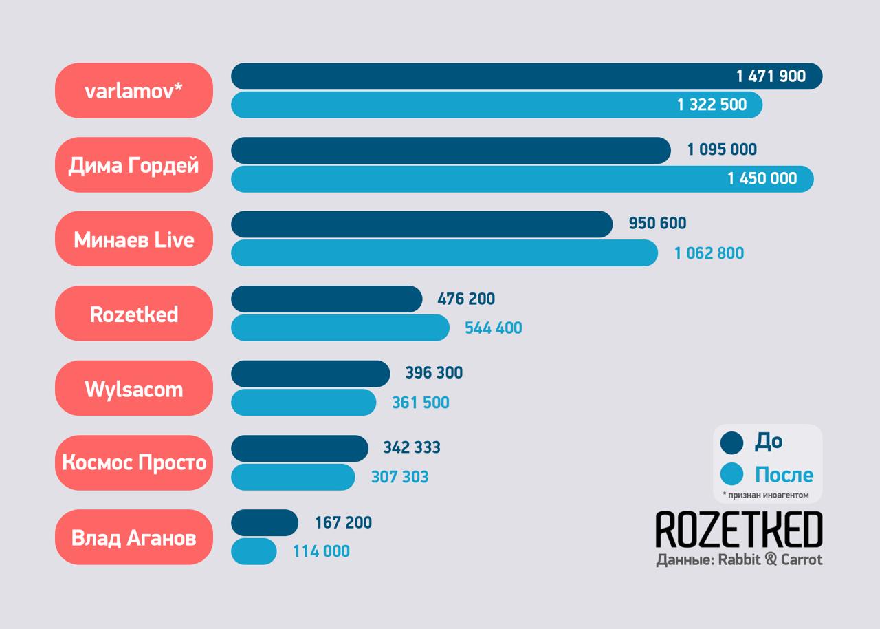 Рекламное агентство Rabbit & Carrot подсчитало среднее число просмотров на роликах от популярных российских YouTube-каналов до начала замедления сервиса и после. Оказалось, что у некоторых авторов охваты даже выросли.