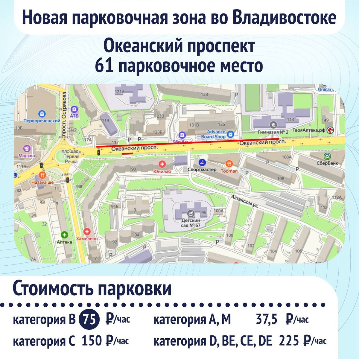 Стоимость часа парковки для автомобилей категории «В» на них одинакова – 75 рублей в час. На всех парковках действует правило оплаты в течение первых 15 минут стоянки. Платным считается время с 08:00 до 19:00 в будние дни. В настоящее время во Владивостоке на улично-дорожной сети работают 42 платных муниципальных парковки открытого типа.