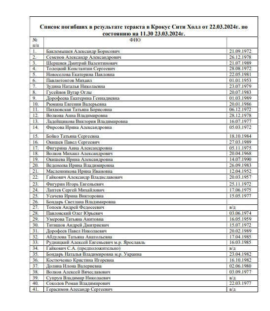 ❗️Установлены имена 41 погибшего в результате теракта в "Крокусе", обновленный список показал Минздрав Подмосковья