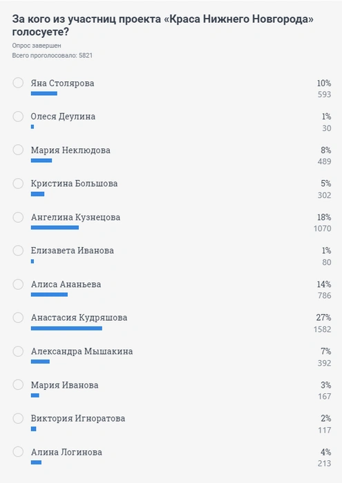 Победительницей номинации NN.RU стала 21-летняя Анастасия Кудряшова. Она набрала 27% процентов голосов. Девушка увлекается иностранными языками и психологией.