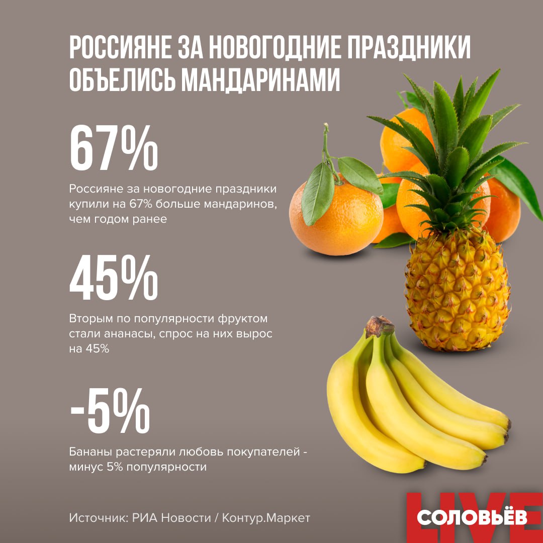 Вторым по популярности фруктом стали ананасы, спрос на них вырос на 45%. Бананы растеряли любовь покупателей – минус 5% популярности.