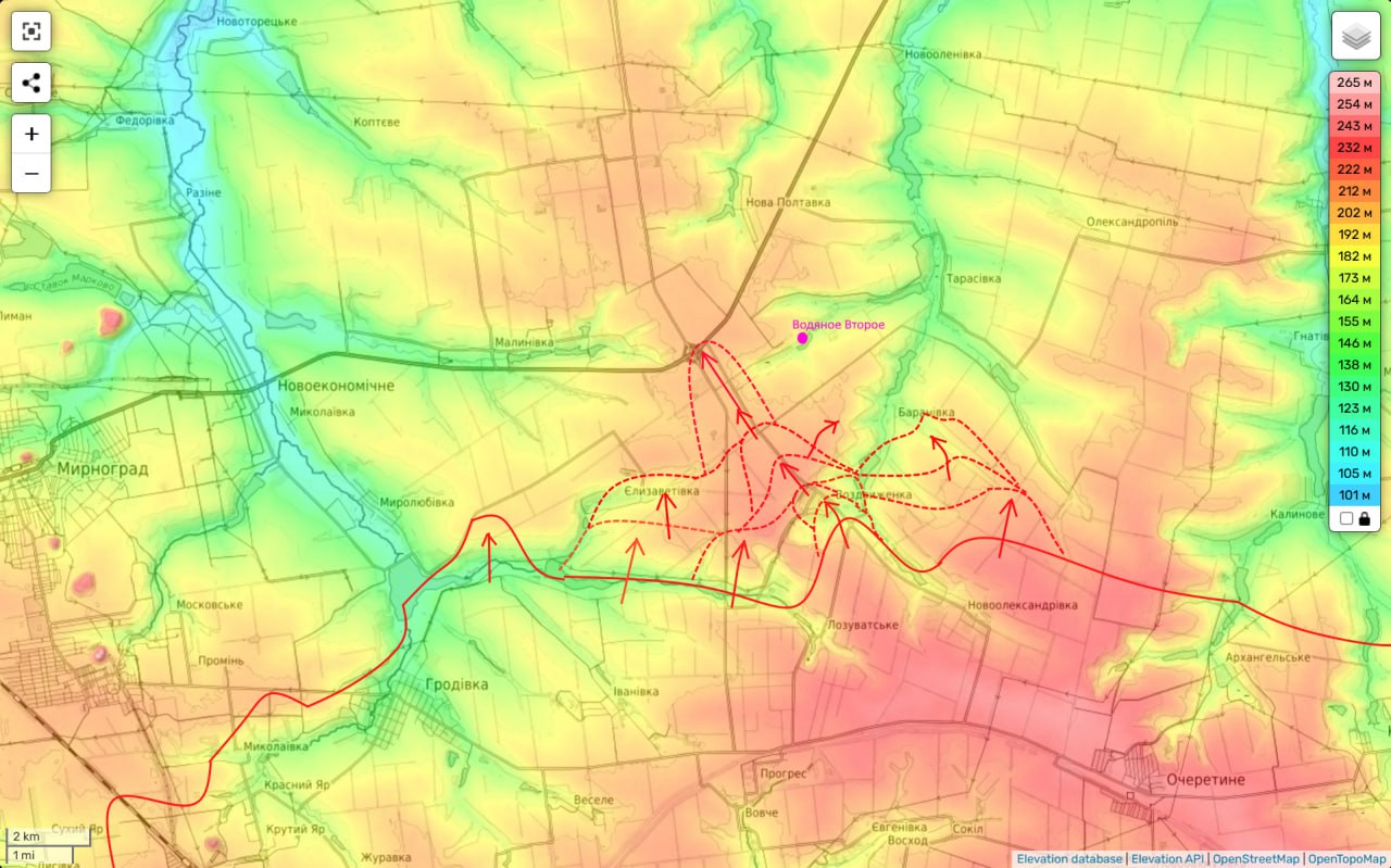Причем, даже беглый взгляд на карту показывает, что наш основной удар наносится не для охвата даже Покровска и Мирнограда с востока (это будет, но потом), а чуть восточнее.