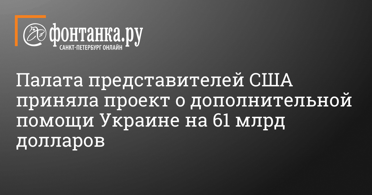Палата представителей США на внеплановой сессии приняла законопроект о дополнительной помощи Украине почти на 61 миллиард долларов. Инициативу поддержали 311 конгрессменов, еще 112 высказались против. Теперь документ направят для рассмотрения в сенат, передает 20 апреля РИА Новости.