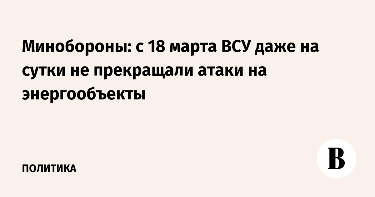 ВСУ даже на сутки не прекращали удары по российским энергообъектам с 18 марта, заявили в Минобороны РФ. То есть, с момента объявления Киевом о якобы соблюдении договоренности по прекращению атак.