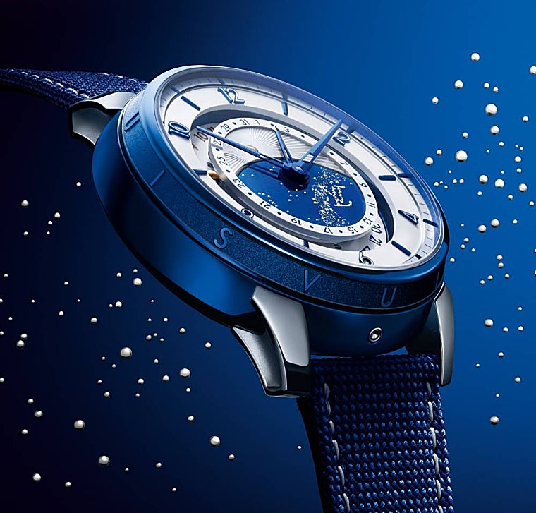 De la esfera destaca también otro detalle inconfundible aportado por De Bethune a la colaboración con Louis Vuitton: el cielo estrellado color azul intenso decorado con pasadores de oro blanco y detalles en pan de oro, con la guinda en forma de constelación de Hércules, un guiño a LV. Todo ello enmarcado por una compilación de calendario que incluye una manecilla también de color azul. Las de las horas y minutos sobrevuelan a su vez el anillo exterior de ambos marcadores.